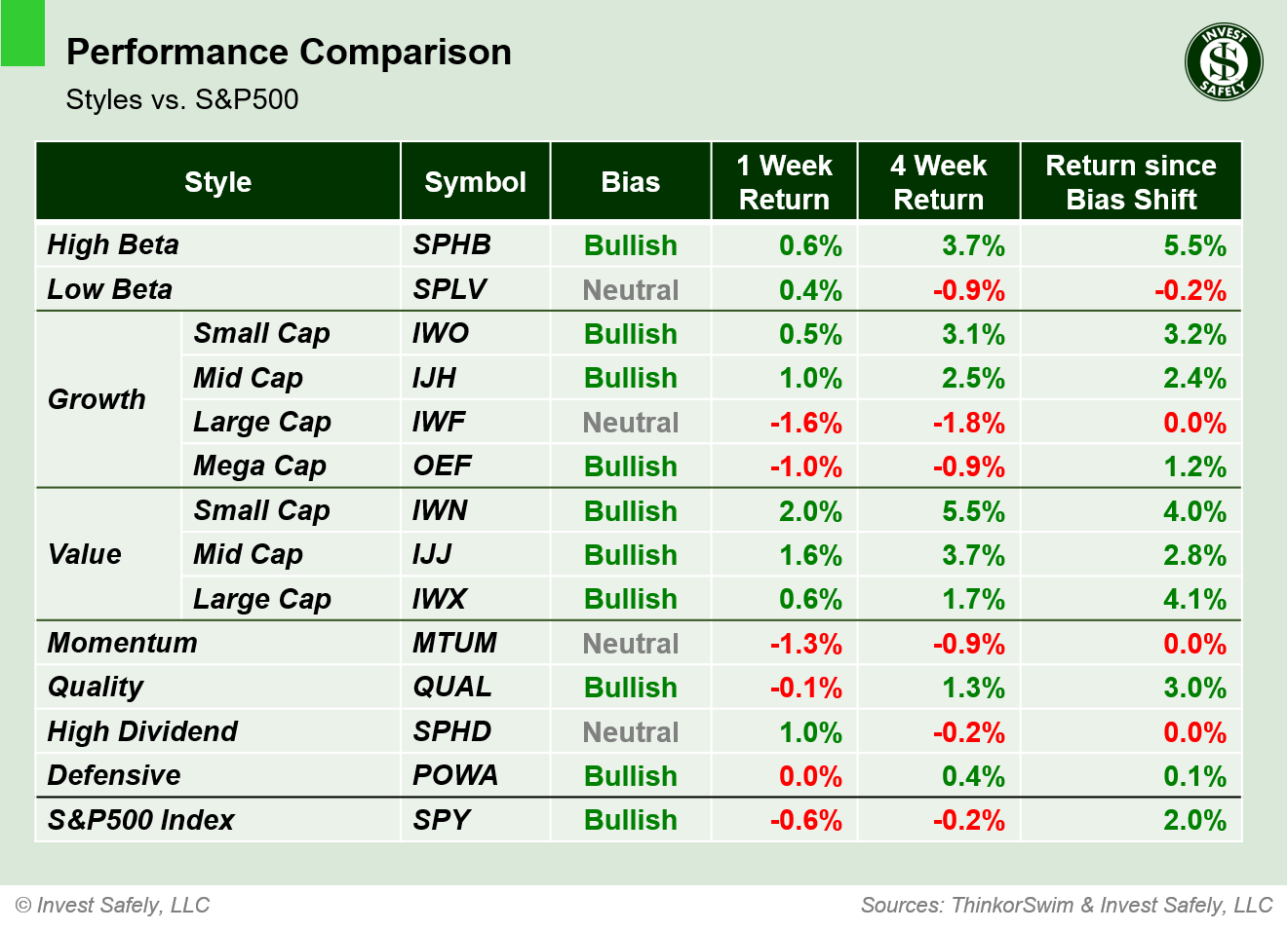 The Small Cap Value ( $IWN ) investing style was the largest gainer. Large Cap Growth ( $IWF ) was the largest loser, again thanks to AI worries. In a reversal of last week's changes, Large Cap Growth and Momentum ( $IWF & $MTUM ) shifted back to neutral bias; Low Beta and High Dividend ( $SPLV & $SPHD ) styles moved up to neutral from bearish.