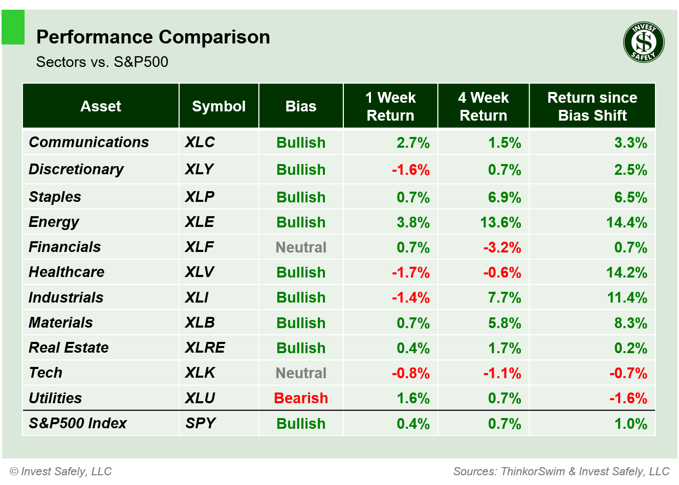 Performance Methodology: All sector performance data is sourced from ThinkorSwim and reflects price‑only returns calculated using end‑of‑week closing data. Bias classifications follow a proprietary Invest Safely, LLC model and update only when trend conditions meet predefined thresholds. All calculations are consistent across every chart on this page.